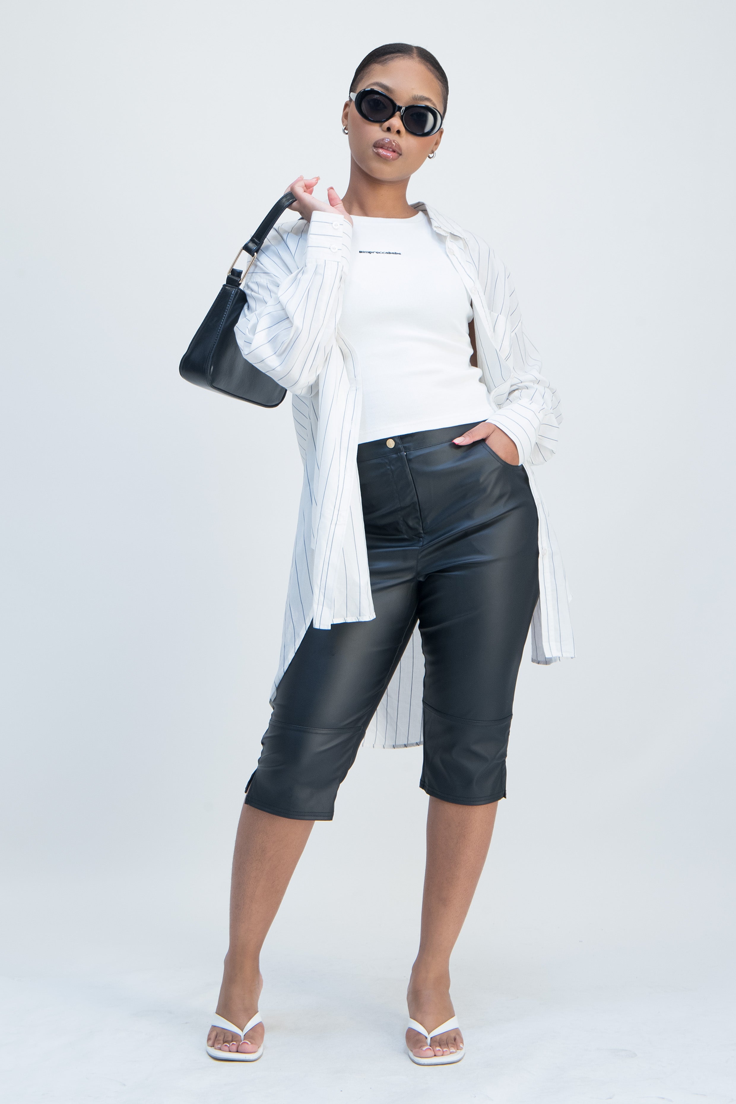 Our Faux Leather Capri Pant is a must-have for your wardrobe! Made in a faux leather with front pocket details. This versatile pant is a staple piece that can be dressed up or down for any occasion. Pair with our Cotton #impreccababe Logo Tank Top for a effortlessly chic look!